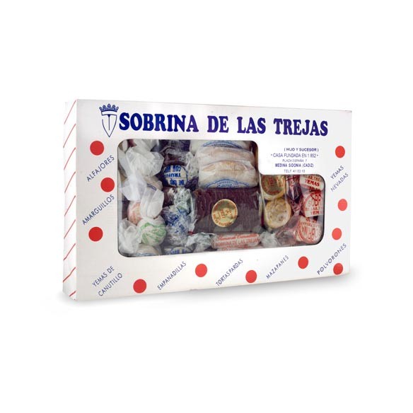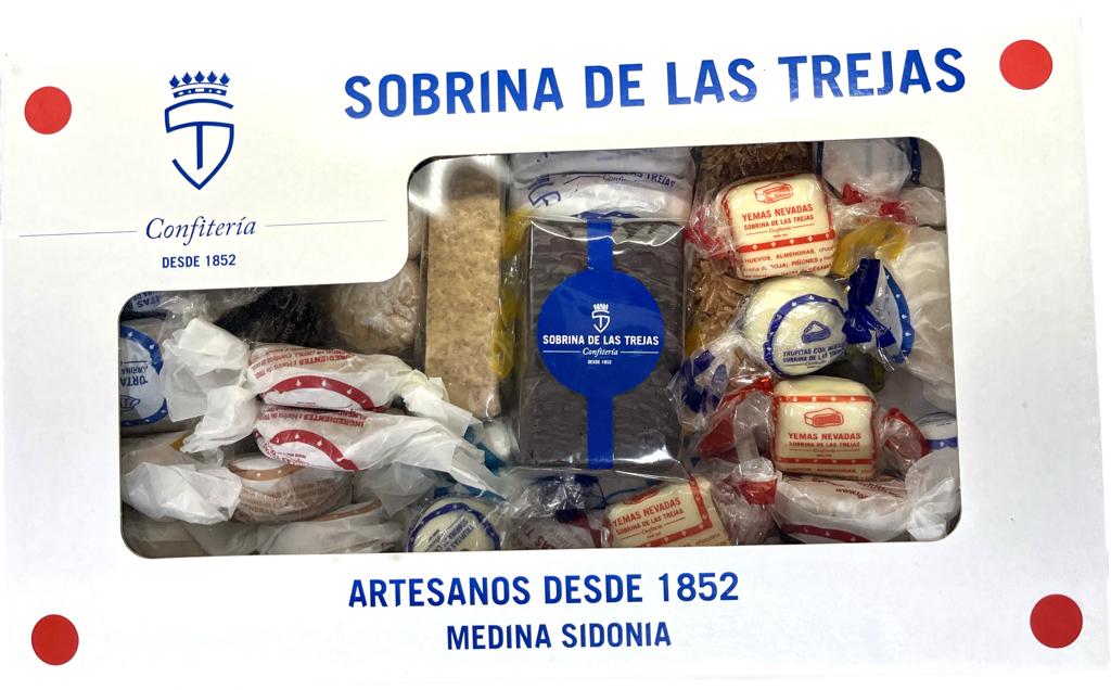 Contenido: 1 turrón trufado, 1 mazapán de frutas, 1 turrón vigas , 1 turrón crocanti, 5 alfajores, 6 amarguillos, 4 tortas pardas, 3 yemas nevadas, 5 yemas de canutillo, 3 empanadillas, 3 trufitas, 3 campanitas, 3 boliñones, 3 lingotes, 4 polvorones almendra, 4 polvorones canela , 4 polvorones nueces y 4 polvorones de limón, .