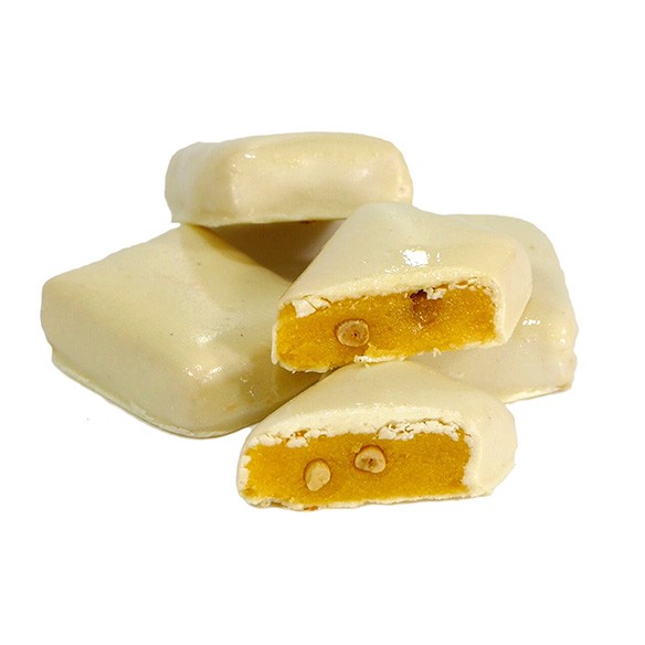 Porción de masa de yema a la que se le introducen piñones. Este preparado se cubre con un baño de chocolate blanco. Uno de los bombones más tradicionales de nuestra confitería.